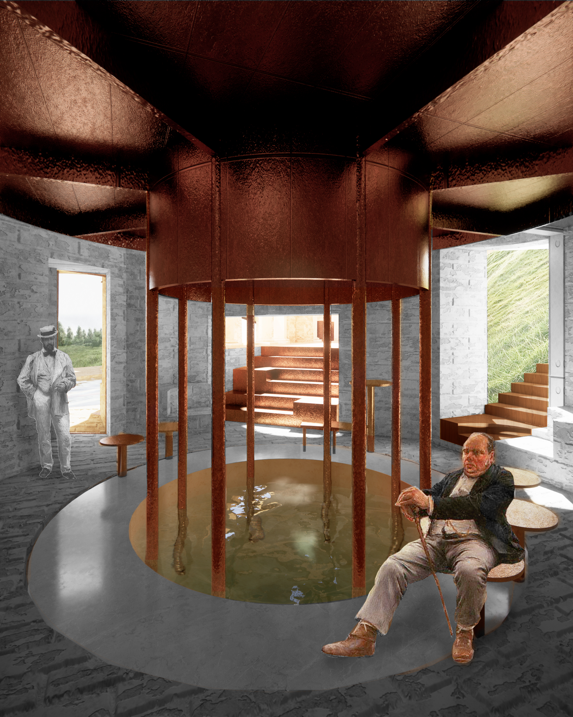The surrounding spaces are reimagined to highlight the contrast and harmony between past and present. The chapel and lounge use both preserved and contemporary elements to evoke unique atmospheres, while the courtyard features a reflective pool that recalls the site’s water theater period, reactivating a forgotten layer of history.